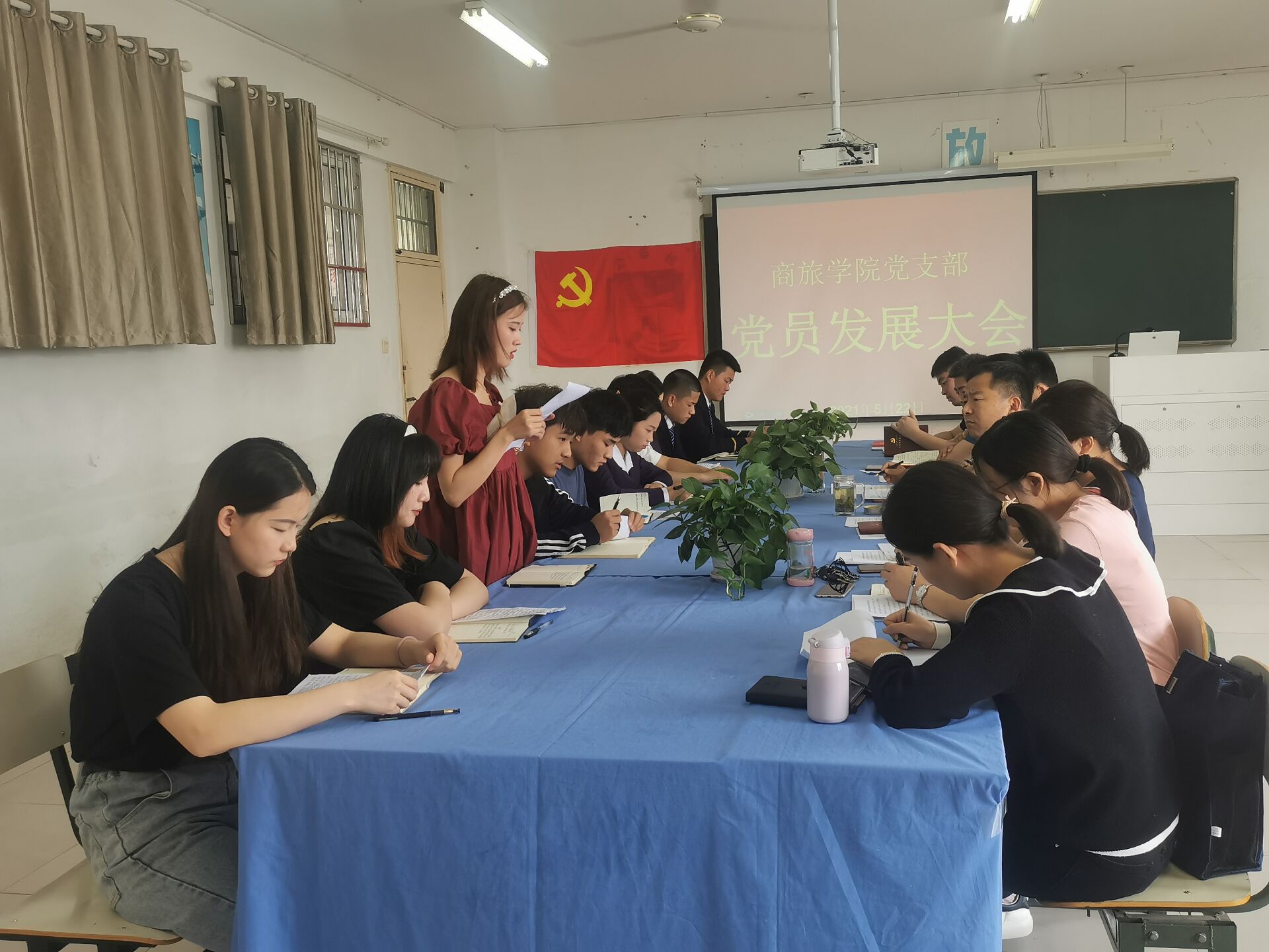 2021年5月22日,商旅学院党支部在行知楼604教室召开2021年党员发展大会。会议由冯登海同志主持,院党委副书记周本顺、商旅学院党支部书记王功菊、支部全体党员和发展对象参加会议。