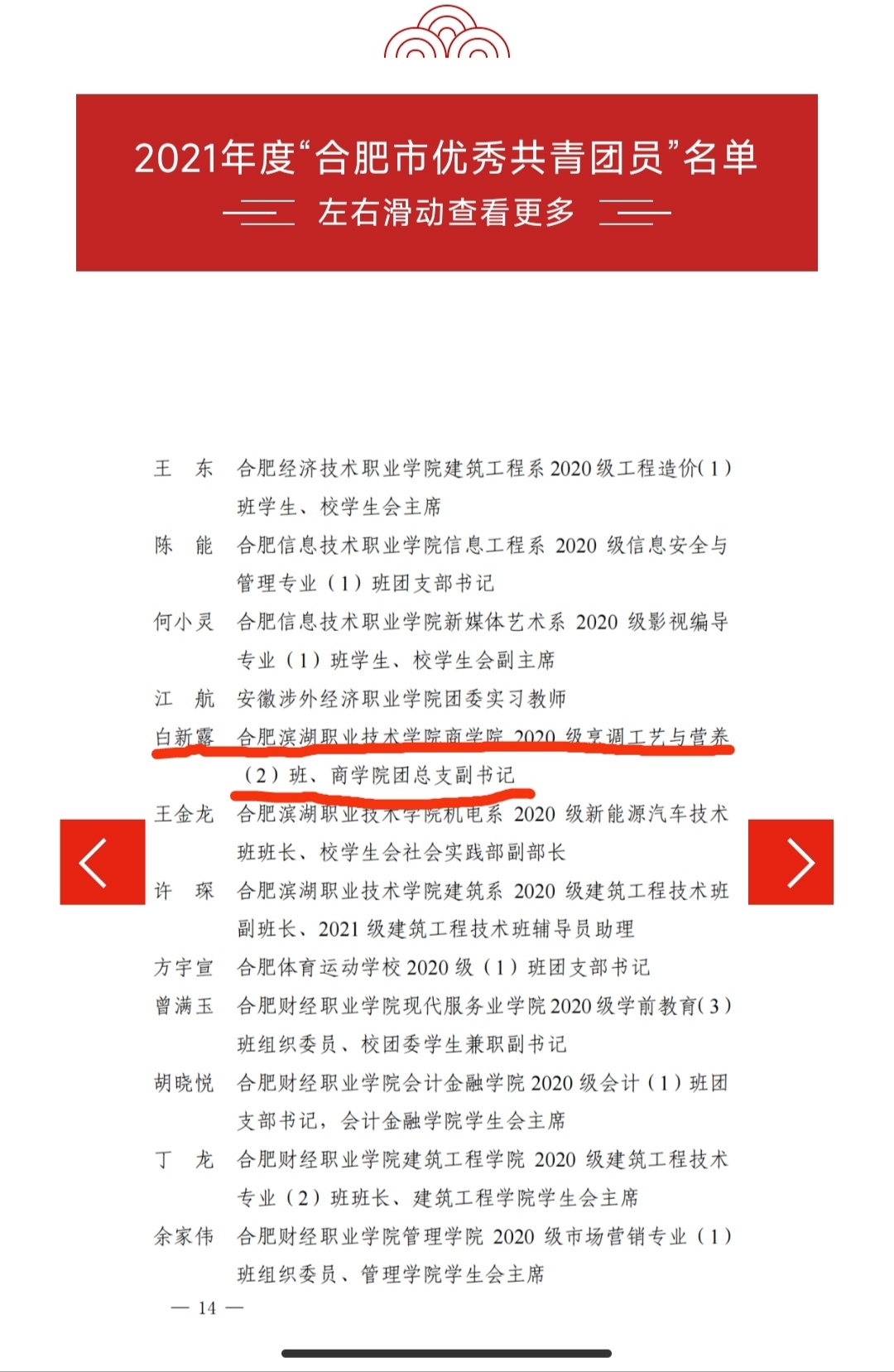 2020级烹调工艺与营养(2)班白新露同学,担任原商旅学院团总支副书记。工作认认真真,兢兢业业,既能时刻严格要求自己,又能处处争当同学们的表率,还能乐于奉献,扎实工作,在同学中威信较高。获此殊荣,是对她的肯定和鼓励。