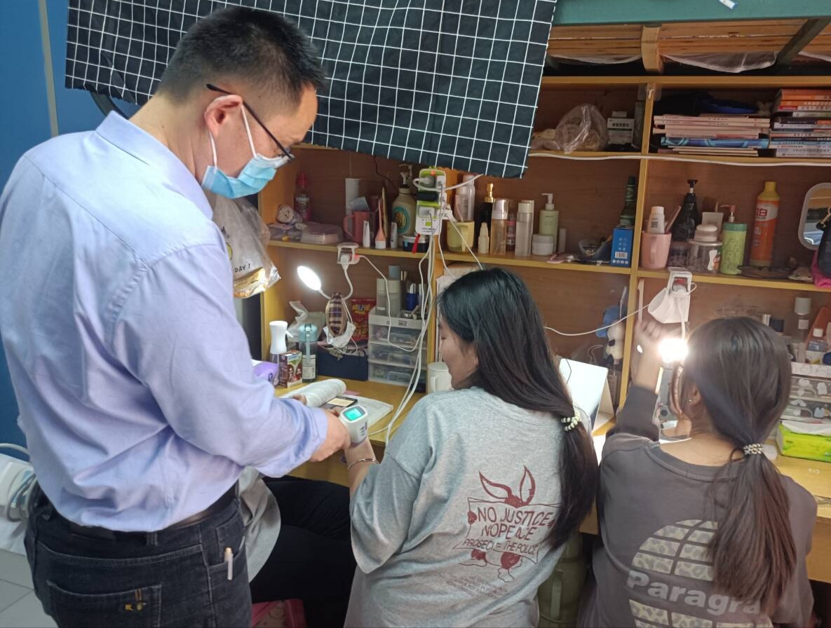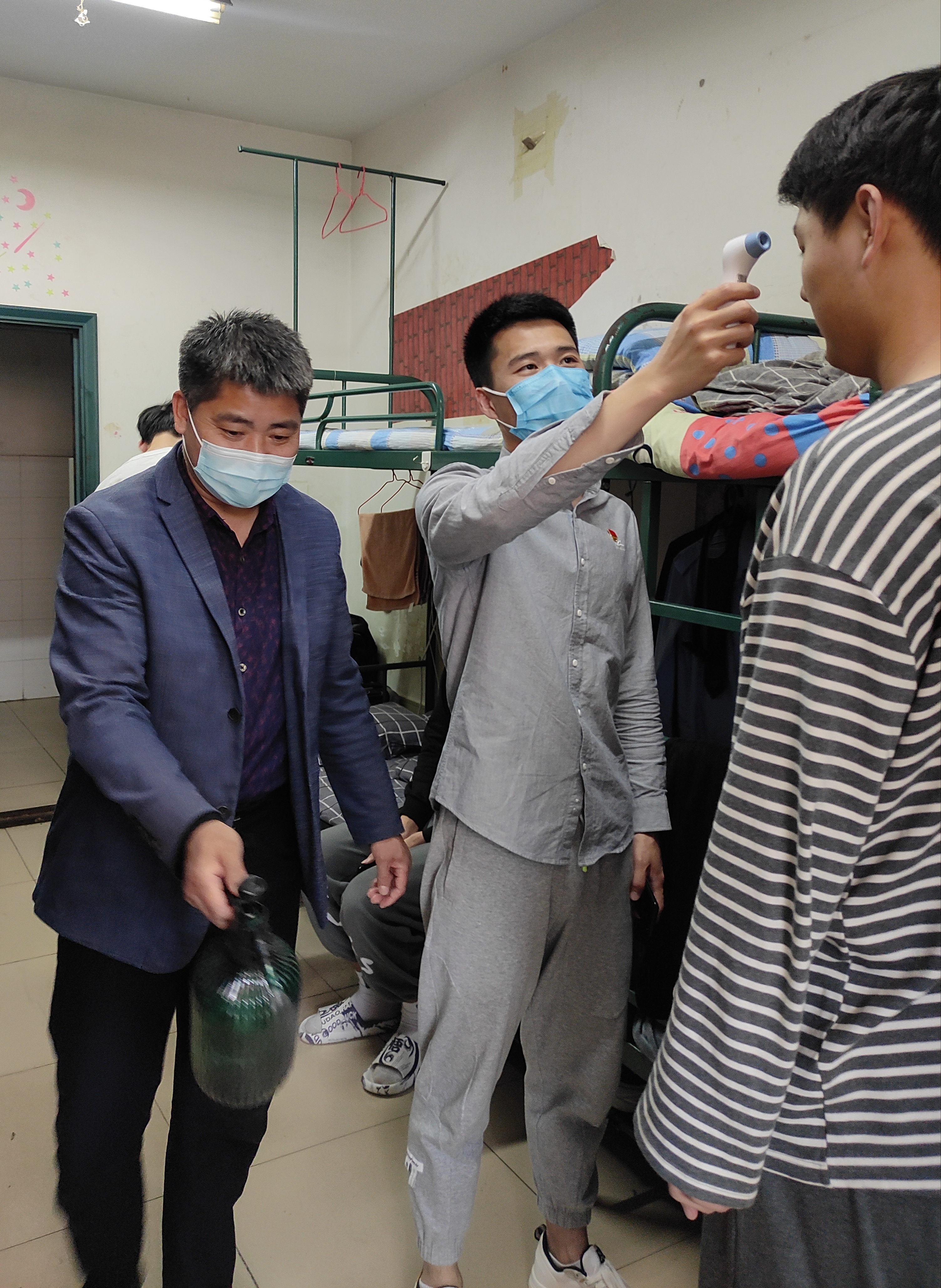 辅导员们坚持做到每日亲自参与晨午晚检工作,每天早晨、中午、晚上都能看到他们深入宿舍的身影。他们或手持体温枪,或拿着体温记录表,仔细地为学生测量体温。 辅导员们每天都会手持或肩背消毒设备,到宿舍喷洒消毒液,对宿舍环境进行消杀。