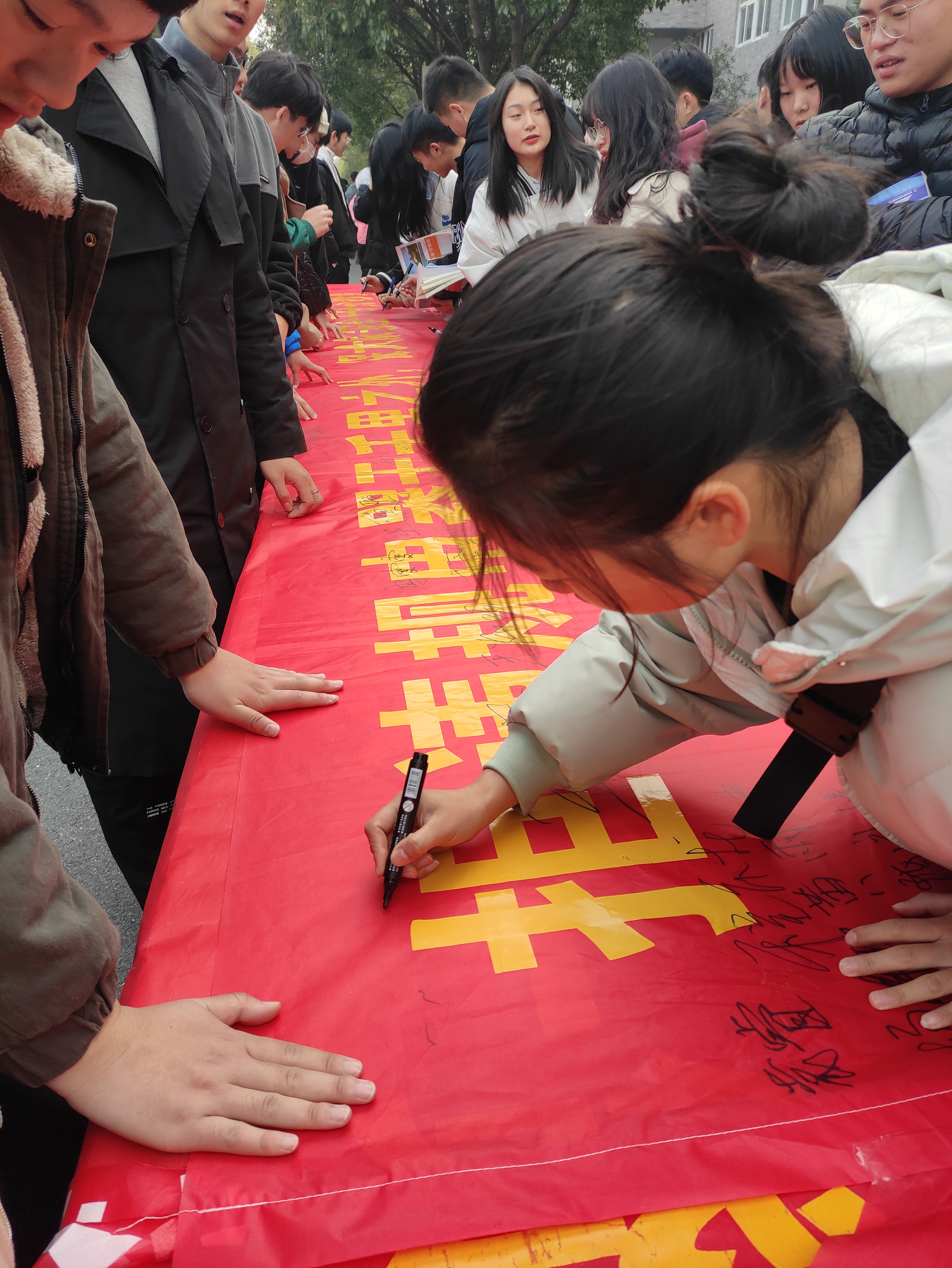 12月14日,商旅学院学生会在行知楼广场举行了拒绝违规用电签名活动。 中午11:30,商旅学院学生会的干部们早早地来到行知楼广场,把印有“拒违规电器于千里之外,保大家安全于分分秒秒”的鲜红横幅铺在签名台