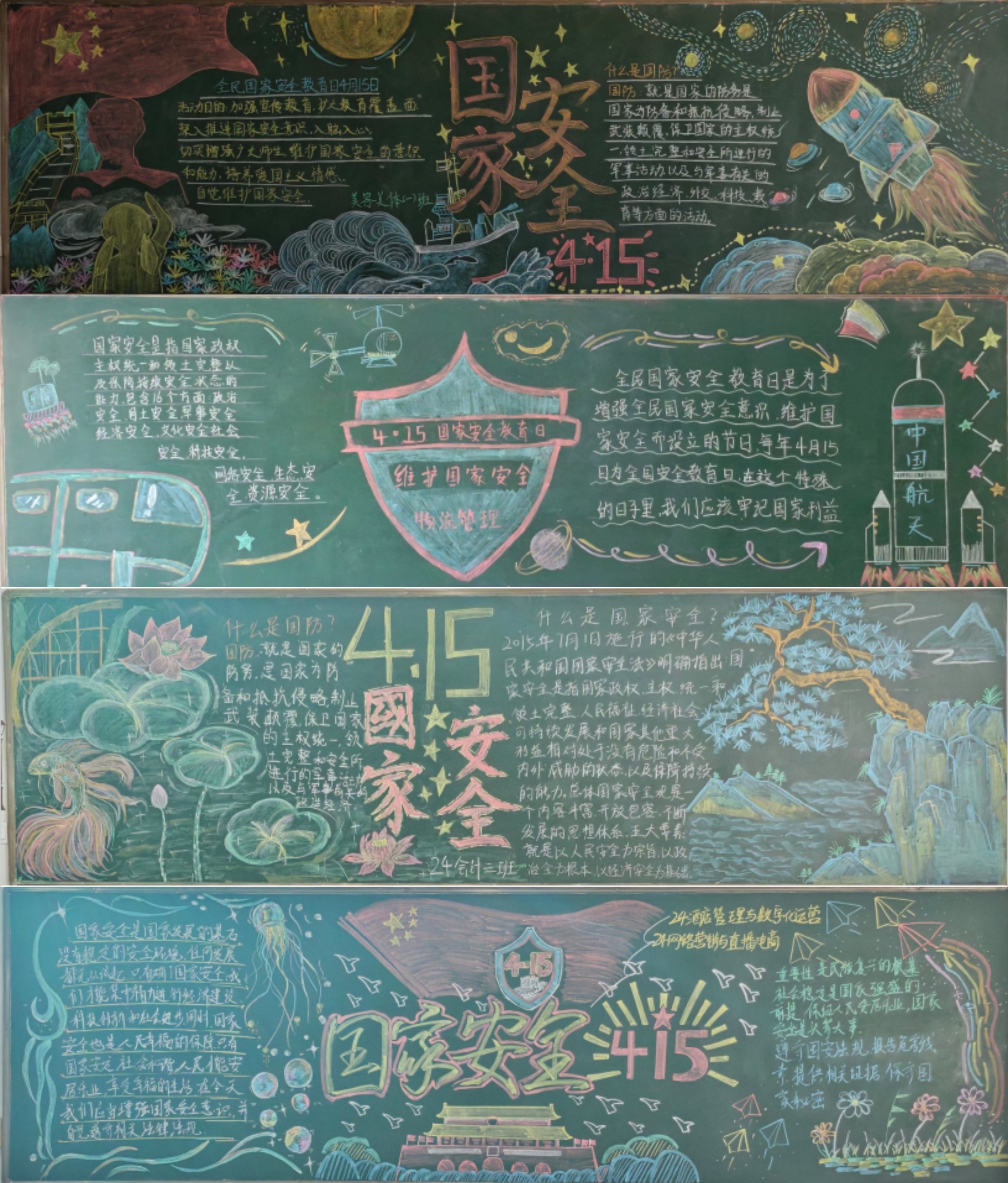 为深入贯彻落实总体国家安全观,增强同学们国家安全意识,营造“国家安全,人人参与”的校园氛围,4月7日至15日,ok138cn太阳集团团总支举办了以“国家安全,人人有责”为主题的黑板报绘画评比活动。