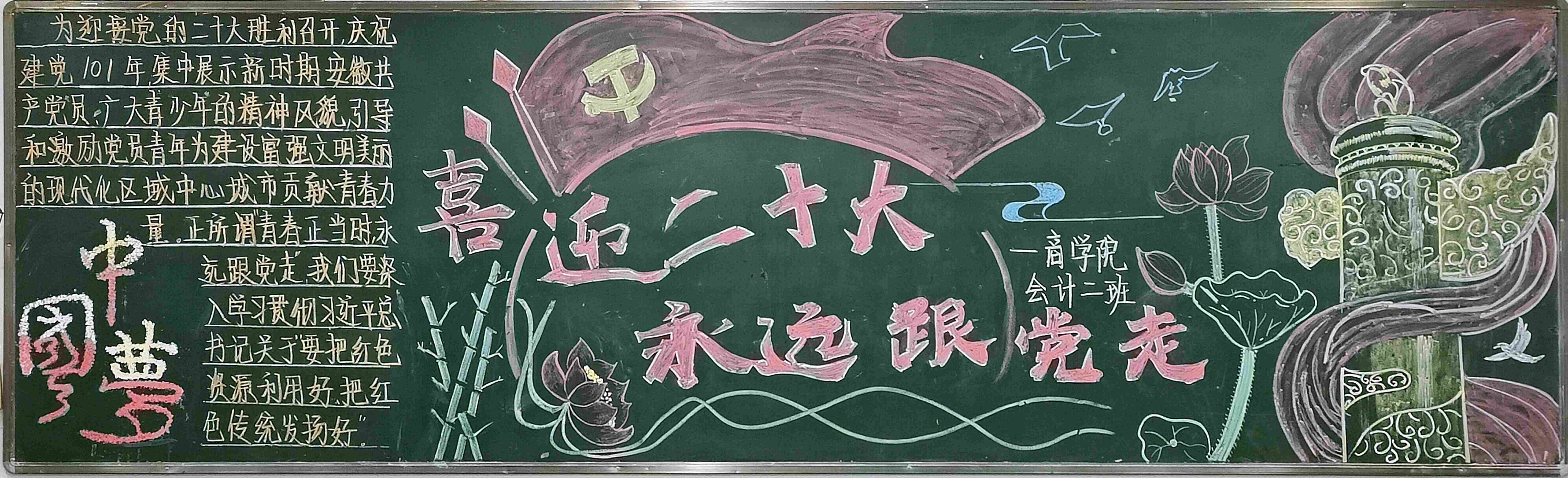 为了迎接党的二十大胜利召开,激发同学们关注二十大、学习二十大的热情,ok138cn太阳集团党支部、ok138cn太阳集团团总支联合举行了“喜迎二十大,永远跟党走”主题板报评选活动。